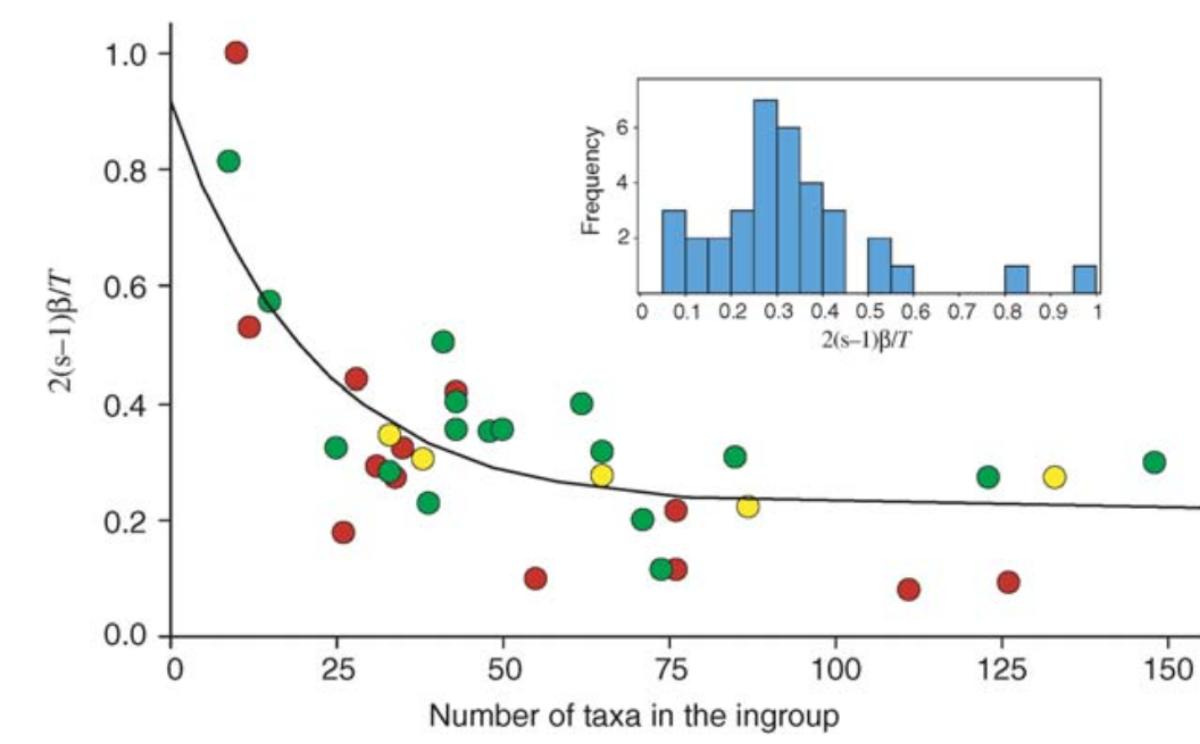If speciation results from natural selection via successive small changes, this is the classic case where you would expect the branch lengths between speciation events to fit a bell-shaped curve.