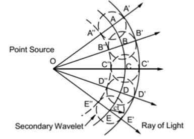 You have a point disturbance at O, in this case light emitted by a stationary source. With water waves, O is where the stone hits the pond. After a certain time, this disturbance will have spread out in a circle, to the points A B C D E in the diagram. These point disturbances combine to form the wavefront, the crest of the wave as it spreads out.