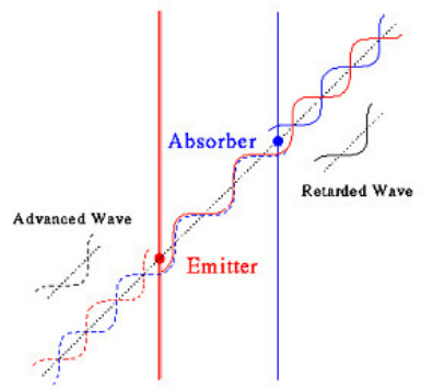 However, in line with Maxwell’s symmetric equations, the absorber will also send an advanced wave back into the past. This is the dotted blue line.
