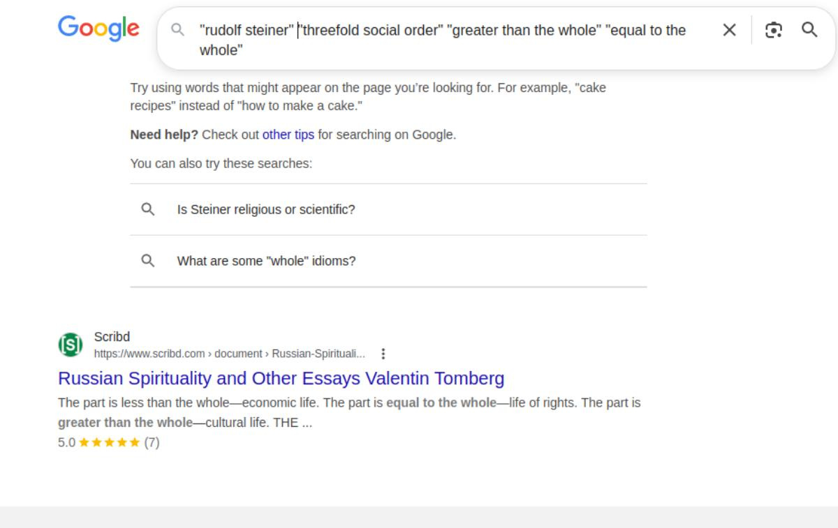 Well, my friend, there are some things I agree with here, and some I don't. Most of all though, I want to make a challenge: how do we build the three fold social order in a way that is 1, seamlessly injectable into technology frameworks, and 2, presented as a core ethos, that young people can understand, without the link to Steiner? I'm a fan of Steiner, but not everyone is. The bigger point though, is that if the TSO is solid, then we just need the physics and not the historical story. That is what my work is all about. What I am dealing with, is that the physics, and general knowledge that we need to build tech on, is not part of the modern Western canon of knowledge. Which presents a bit of a difficulty. Deadline, yeah, we definitely agree on that one. I put everything into my work, over and over again, and it's me that will die if I don't make it over the finish line. Not just me, but any of us in the similar condition. While society will just keep on slowly walking into technocracy until the biosphere and/or cosmos does a hard reset. It's not our responsibility to fix everything, but rather to do what we can. For the world, and for each other. Thank you
